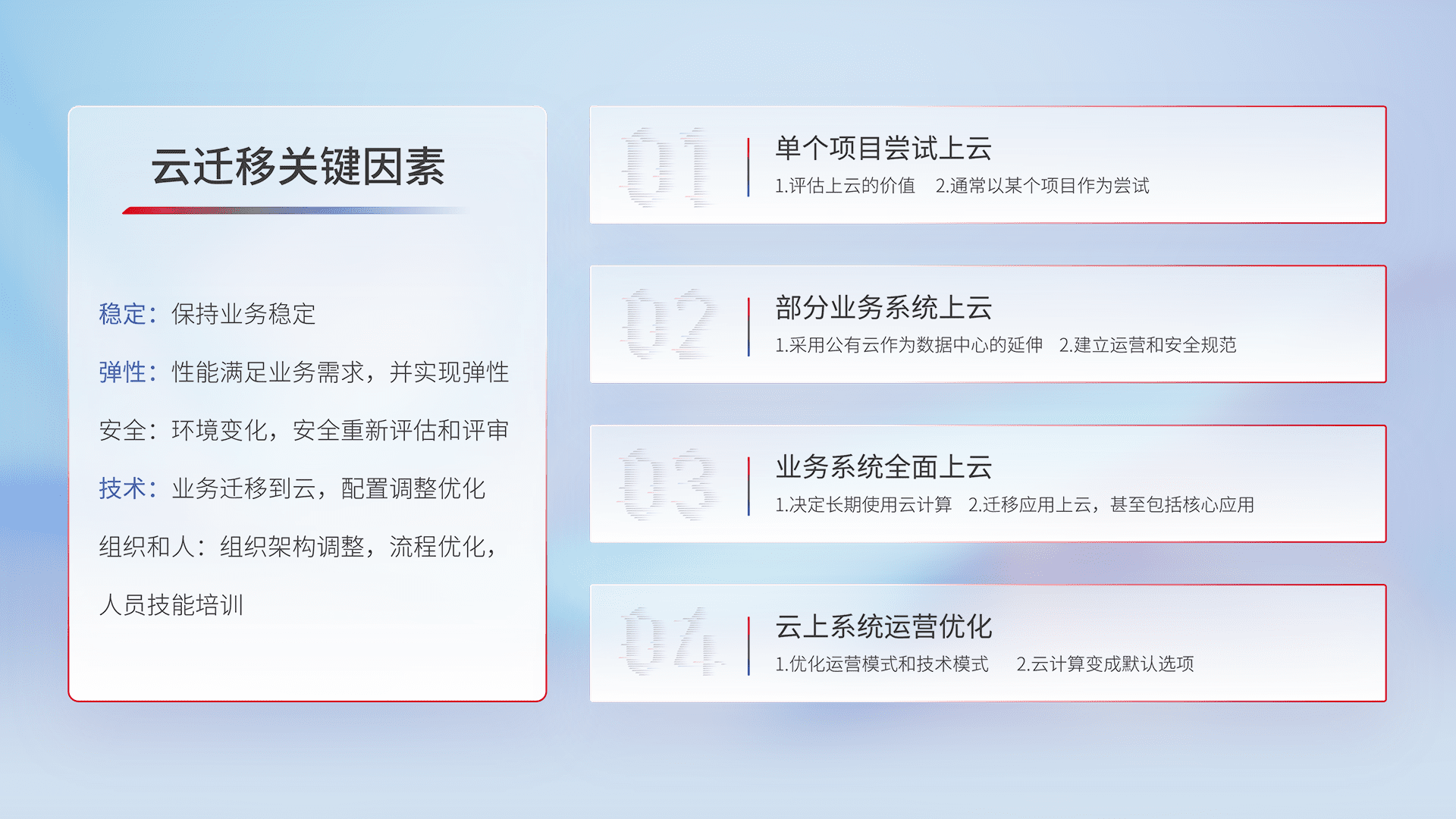 结合实际业务,,从规划设计、、、云平台选型、、、、云原生改造、、、数据迁移、、、集成交付,,,,迁移全过程为客户识别最佳上云路径,,做好风险识别管理,,,,设计网络架构、、、、身份权限、、安全审计合规、、、操作审计、、、、日志审计、、监控告警策略、、、多站点容灾设计等,,,对云上基础设施进行整体规划,,提升IT治理水平,,,以满足弹性、、、高可用、、、高性能的需求。。。。