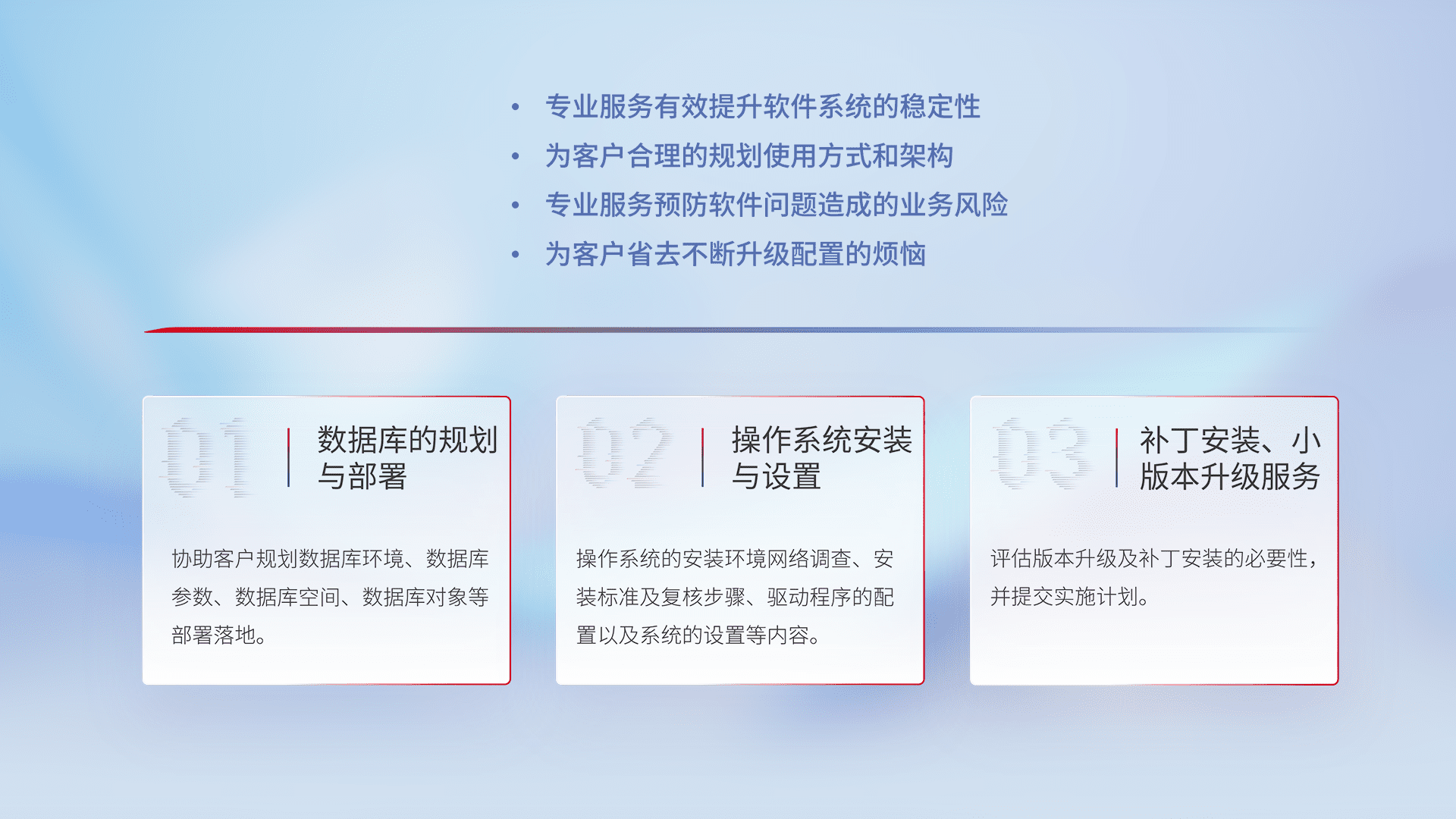 为客户提供软件规模升级、、快速部署、、、、按需配置的专业服务,,,从数据库的规划与部署到操作系统的安装与设置,,,再到补丁安装和小版本升级提供支持。。