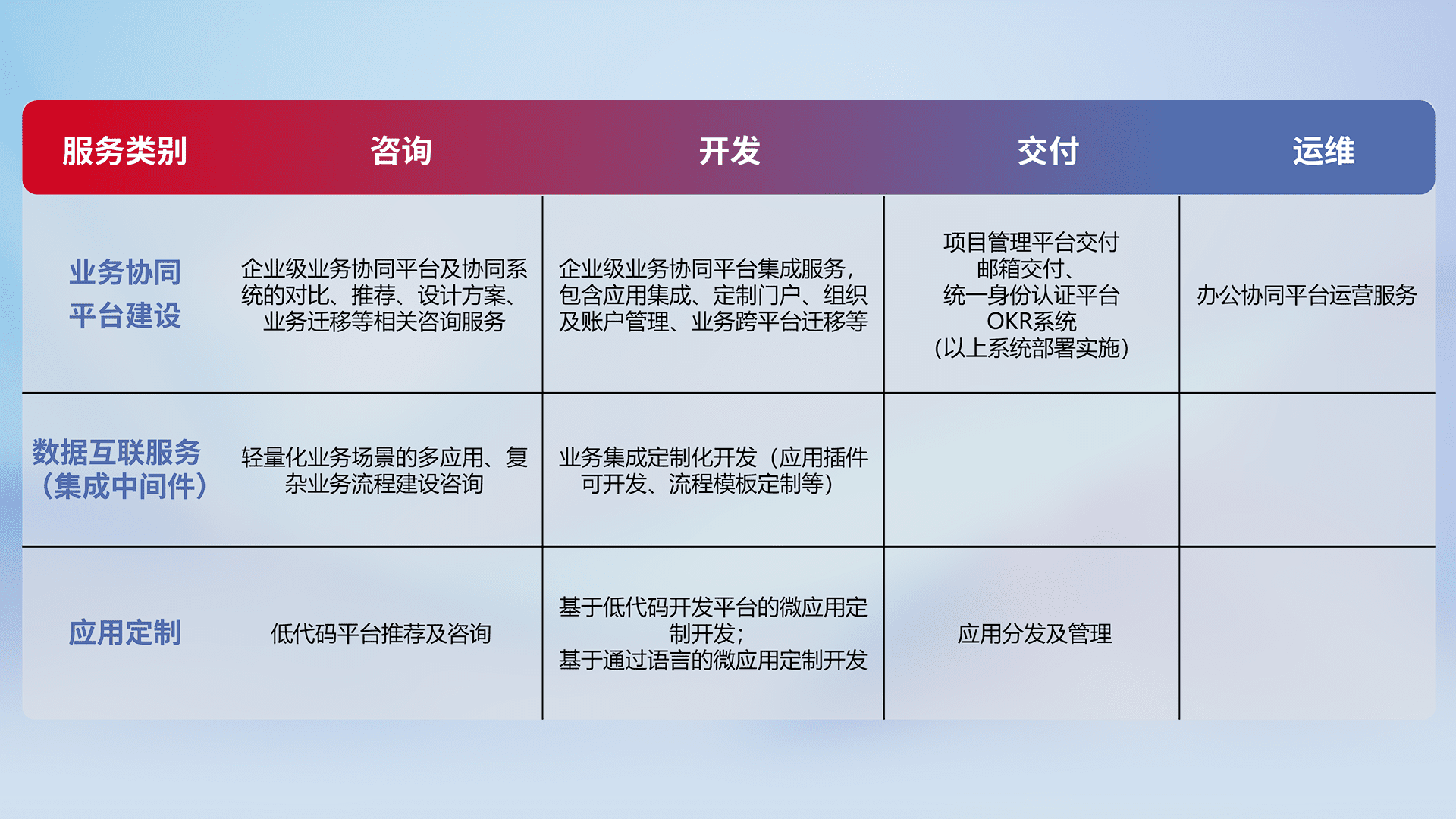 针对钉钉、、、企微、、、IDaas等平台级产品提供产品的规划、、方案、、、交付、、定制化开发等服务,,,实现如统一协同办公、、、智能客户服务、、、混合会议管理、、、、智能数据查询、、等业务场景,,,实现数字化转型。。。